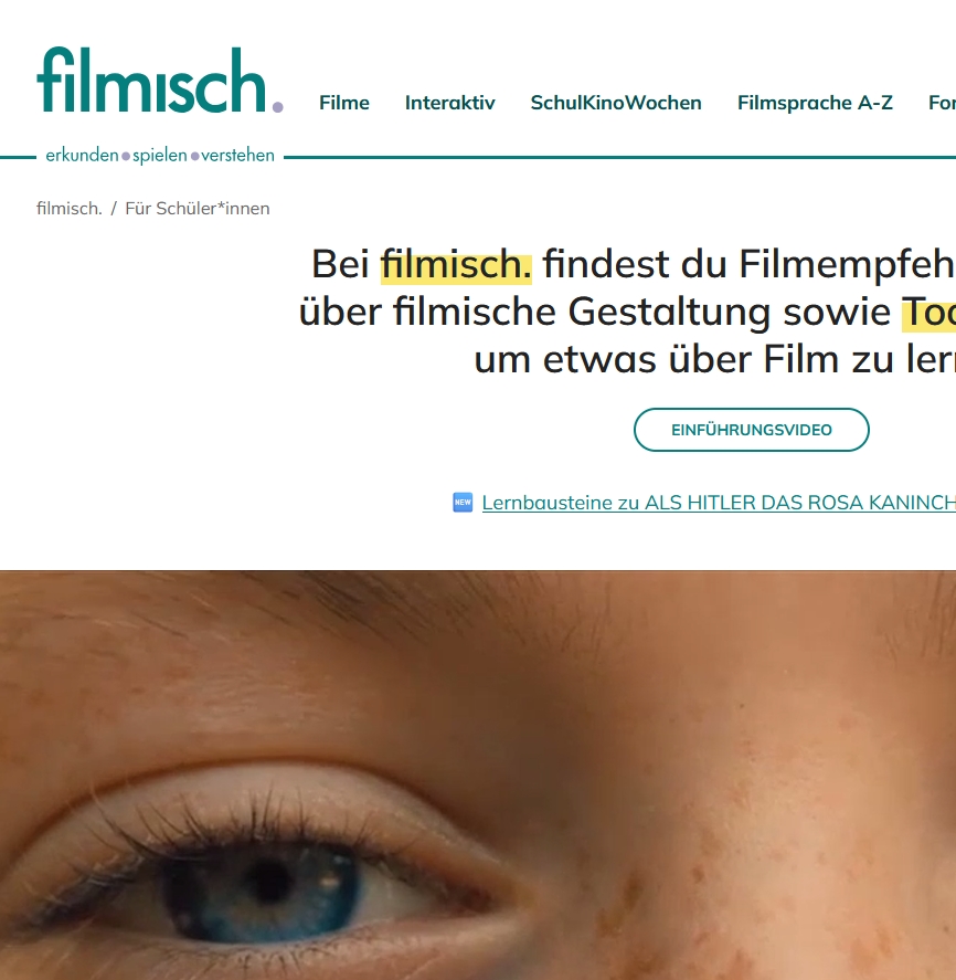 filmisch. bietet dir Infos zu Filmen, interaktive Lernbausteine zu ausgewählten aktuellen und historisch relevanten Filmen, einen Filmbildungskurs auf drei Niveaus, ein filmsprachliches Lexikon sowie ein Forum, in dem du weitere Plattformen und aktuelle Tipps zu Film findest.